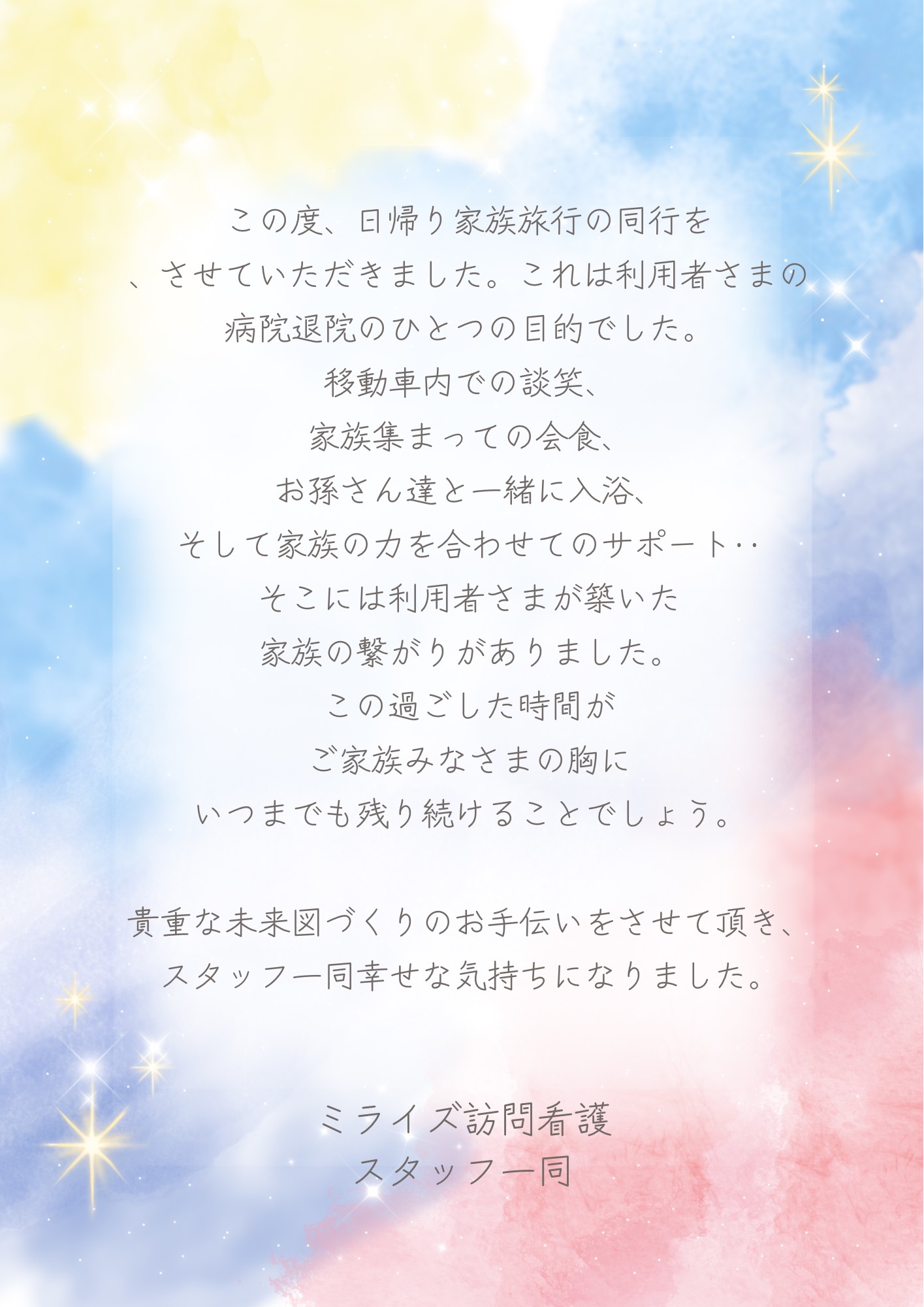日帰り家族旅行の同行 公開日:2025年12月30日 Uncategorized 関連記事 年末のご挨拶と年末年始休暇のお知らせ年末のご挨拶と年末年始休暇のお知らせミライズ訪問看護の訪問におけるDX情報活用加算の算定追加について 投稿ナビゲーション ミライズ訪問看護の訪問におけるDX情報活用加算の算定追加について年末のご挨拶と年末年始休暇のお知らせ